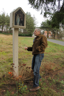 Het valt me op dat ze er eigenlijk allemaal hetzelfde uitzien. Mariabeeldje in het midden, aan weerszijden een potje met heel oude plastic bloemen en een ruitje ervoor. Meestal een puntdakje en altijd staat Maria te hoog. Ik moet bijna op mijn tenen en dan nog kan ik niet echt binnen kijken.